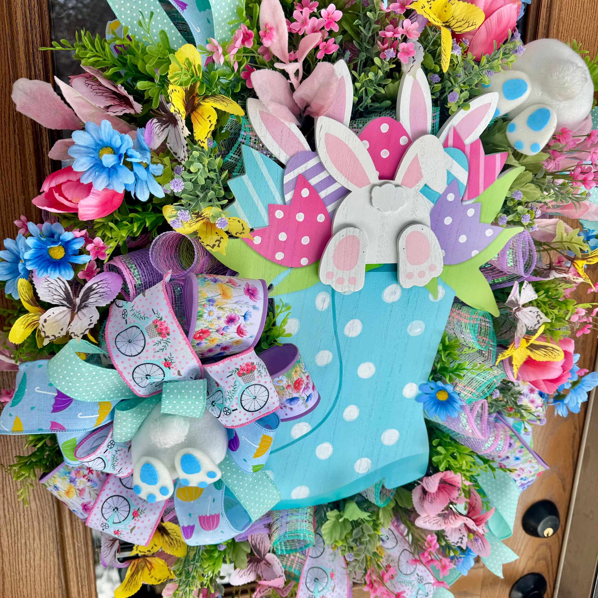 Brighten up your front door with this charming Easter floral wreath! Bursting with vibrant spring florals, playful butterflies, and whimsical bunny details, this wreath is the perfect spring door decor.