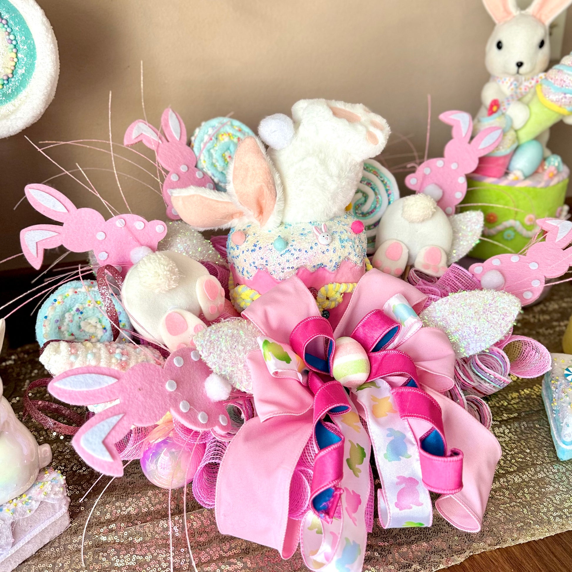 Bursting with pastel colors, playful bunny accents, and sweet candy-inspired details, this handcrafted arrangement is perfect for elevating your Easter home decor.