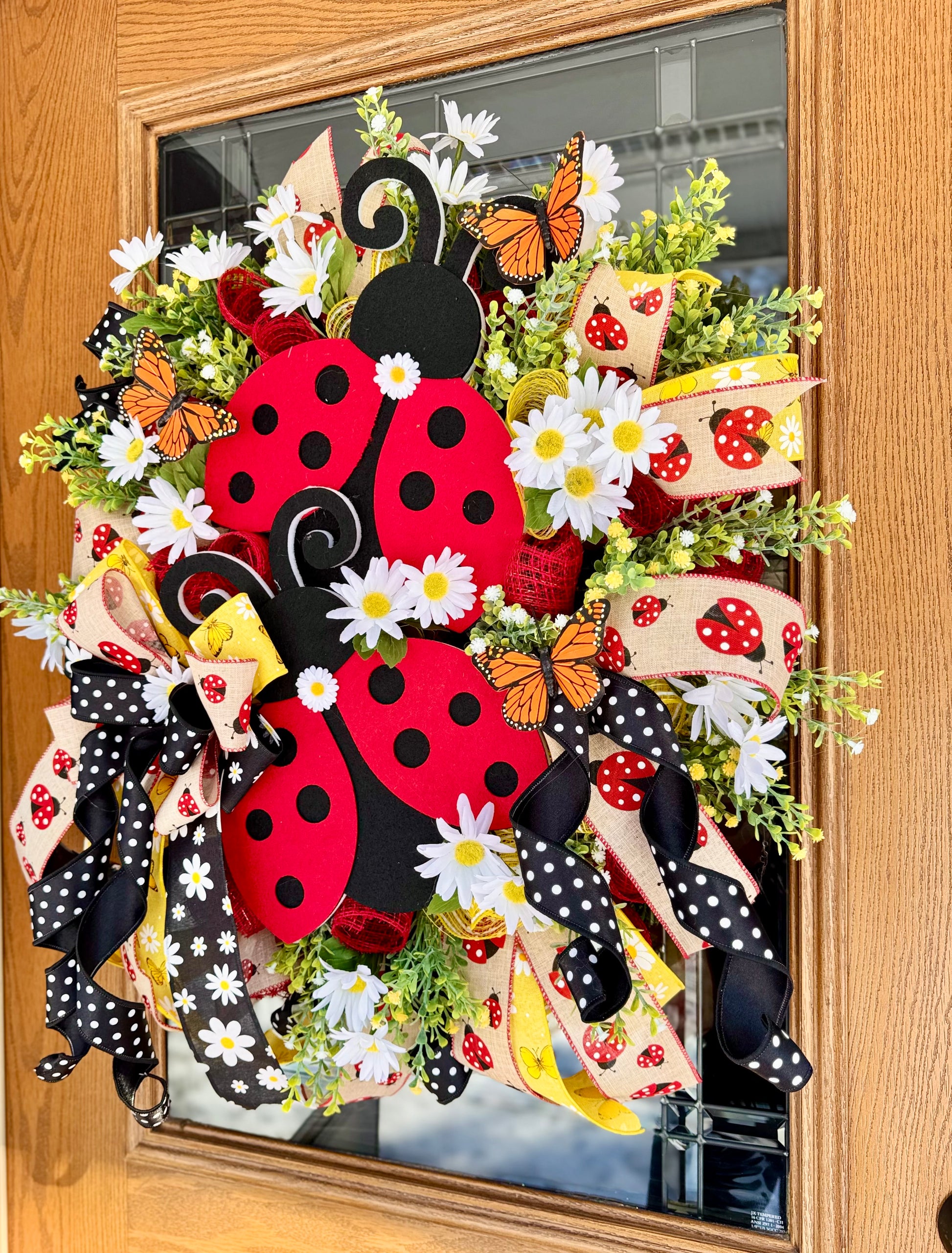Welcome the season with this vibrant ladybug wreath! Featuring bold red and black ladybugs, lush greenery, cheerful daisies, and fluttering butterflies, it’s a playful statement for your front door. High-quality wired ribbons in ladybug prints, polka dots, and sunny yellow add charm and dimension.