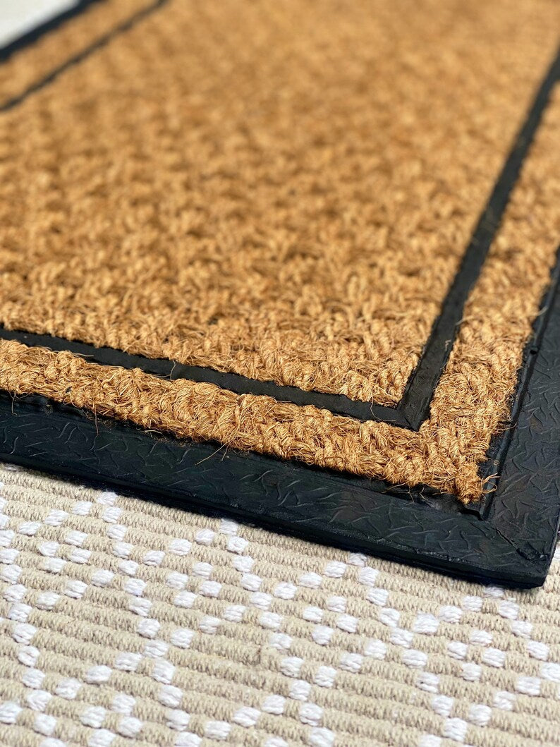 - Our welcome mats have a slip resistant pvc backing with 100% coir front. The coir is naturally made with coconut husks. Each one has a variation of shades of the husks, which make each doormat completely unique!