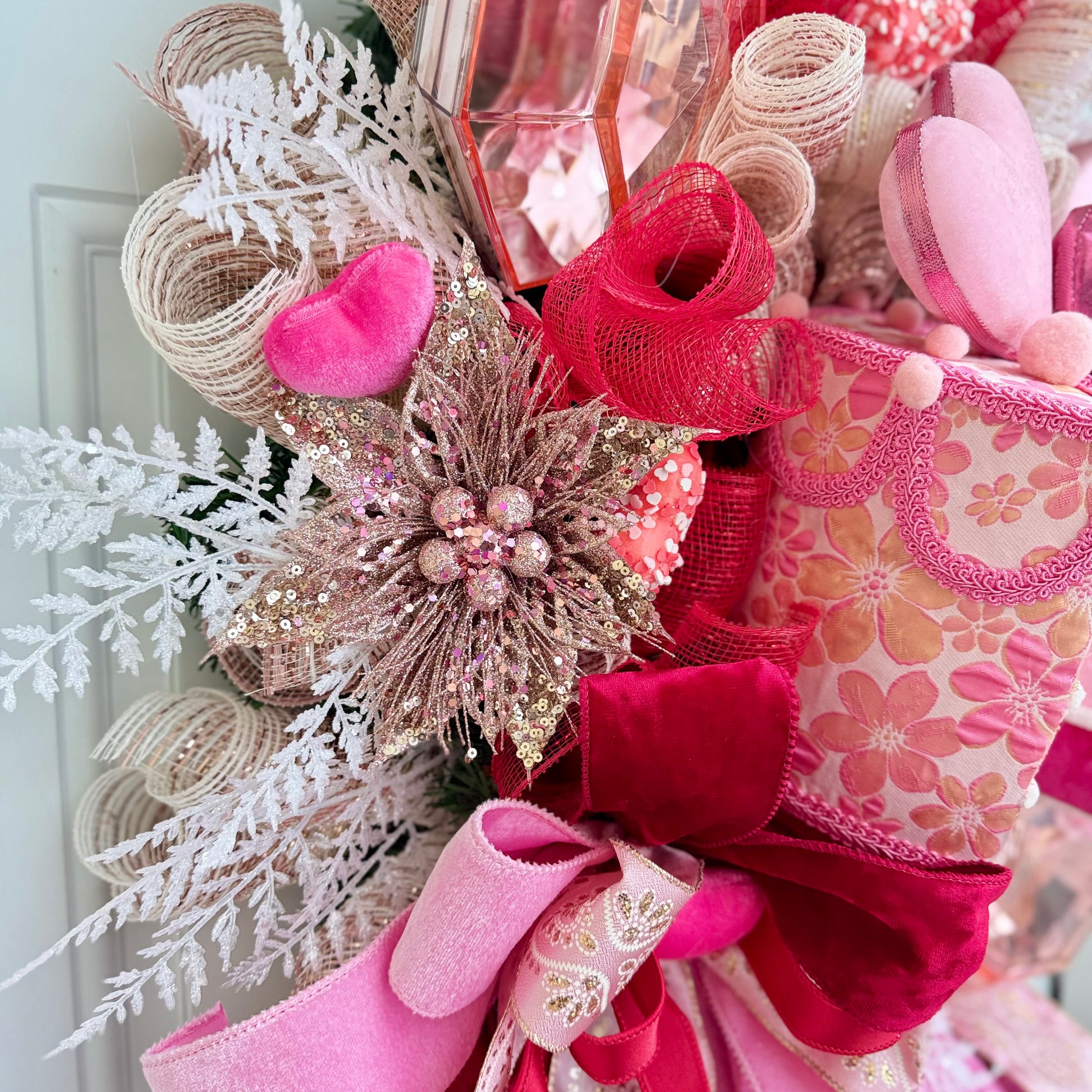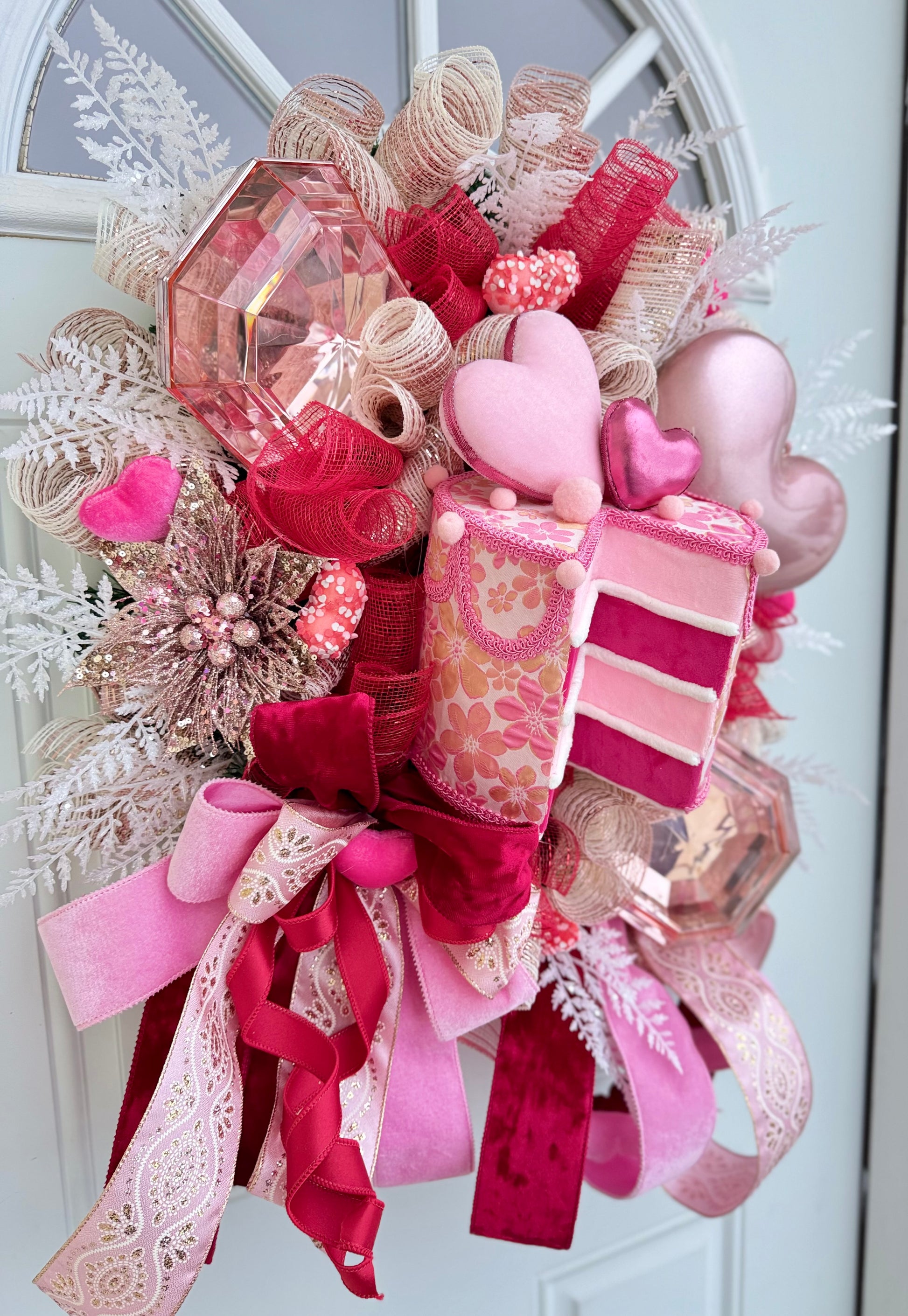 Add a little sparkle to your Valentine’s decor with this handcrafted jeweled cake shop wreath. Featuring a plush pink cake slice, shimmering hearts, and luxe ribbon details, this statement piece brings sweet charm and romantic flair to any door or space.
