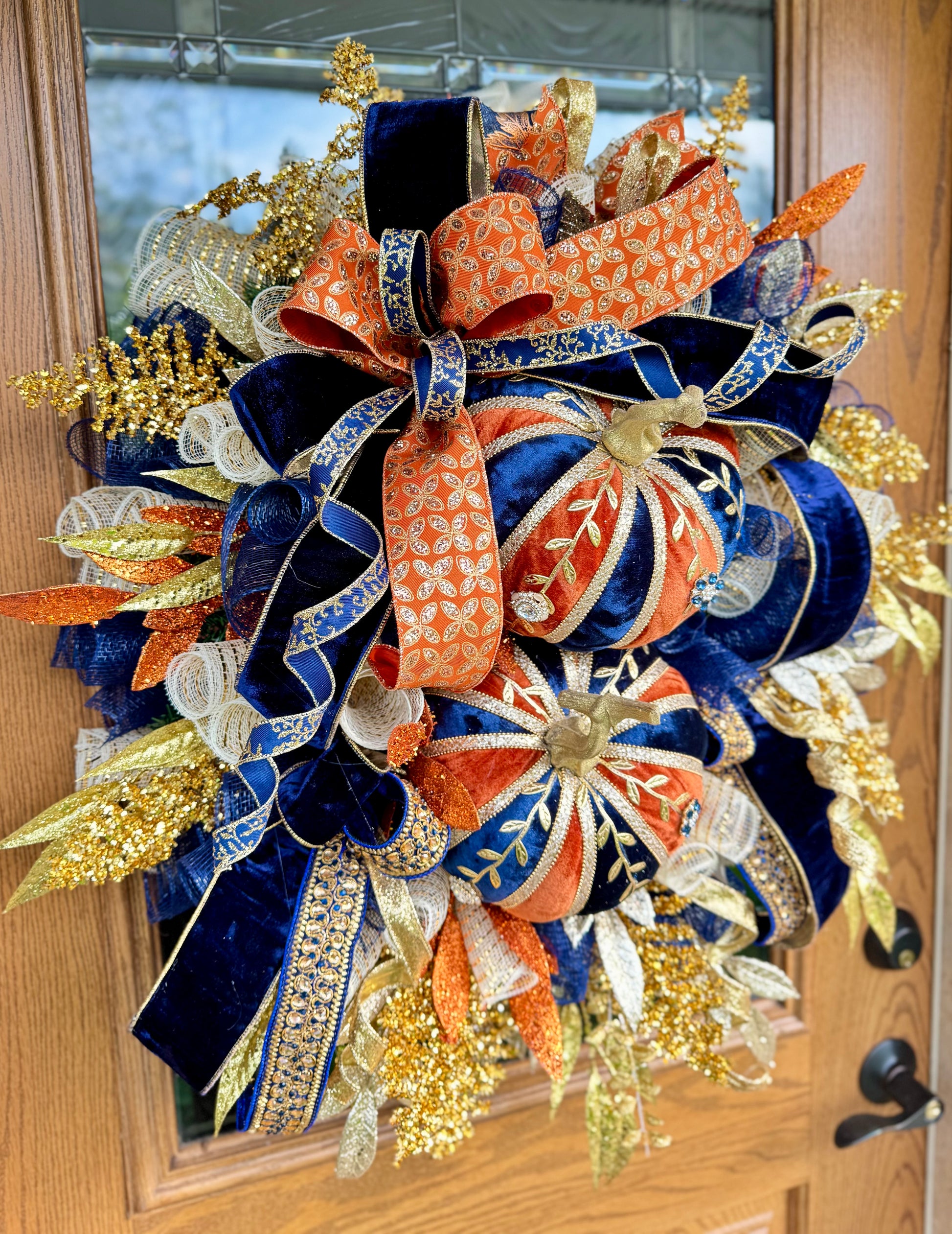 Orange And Navy Pumpkin Wreath | Luxury Fall Wreath | Large Fall Wreaths | Fall Wreaths For Front Door