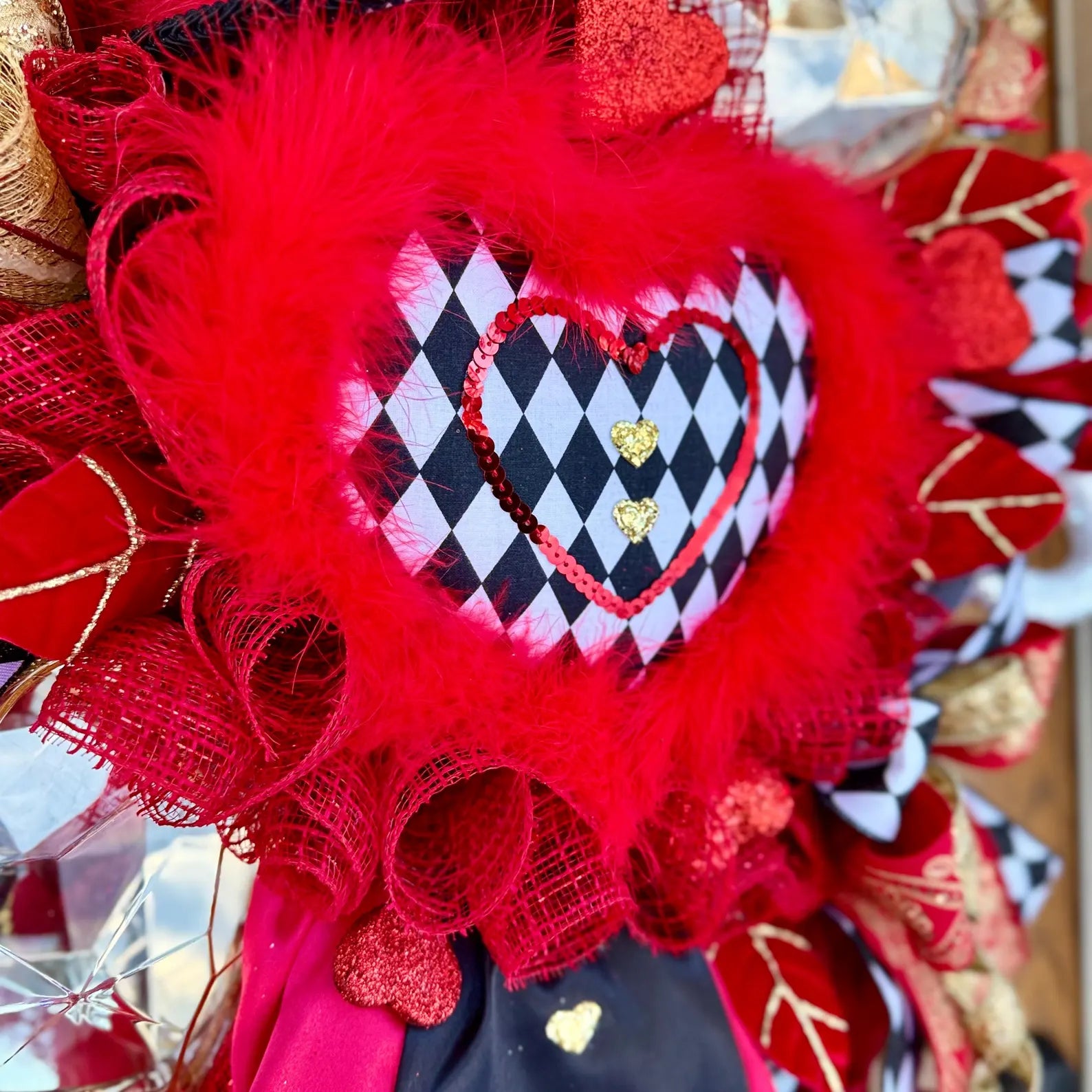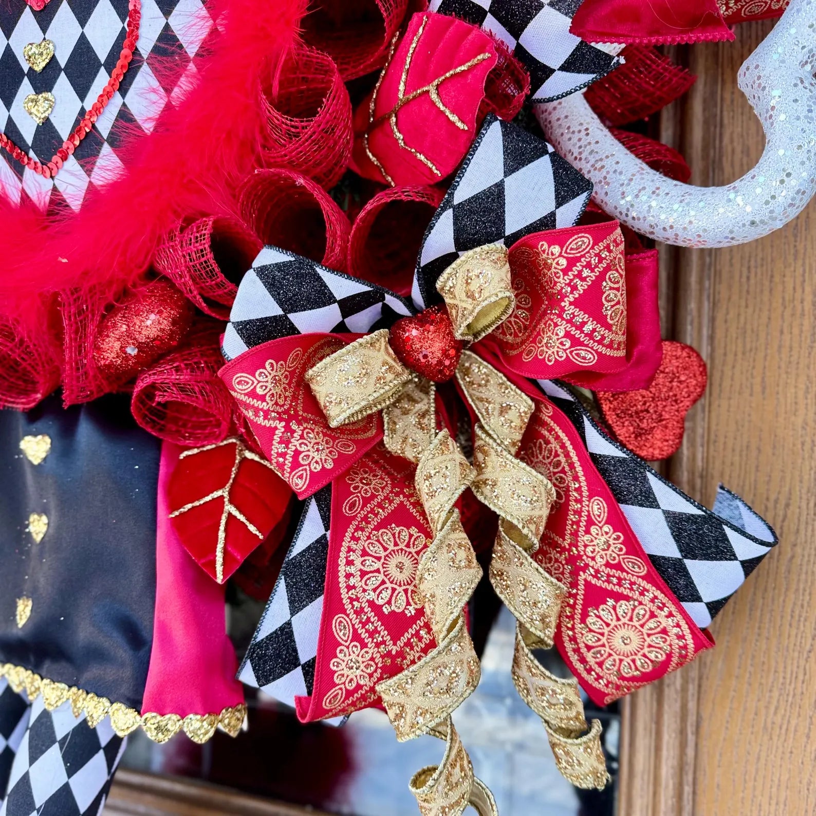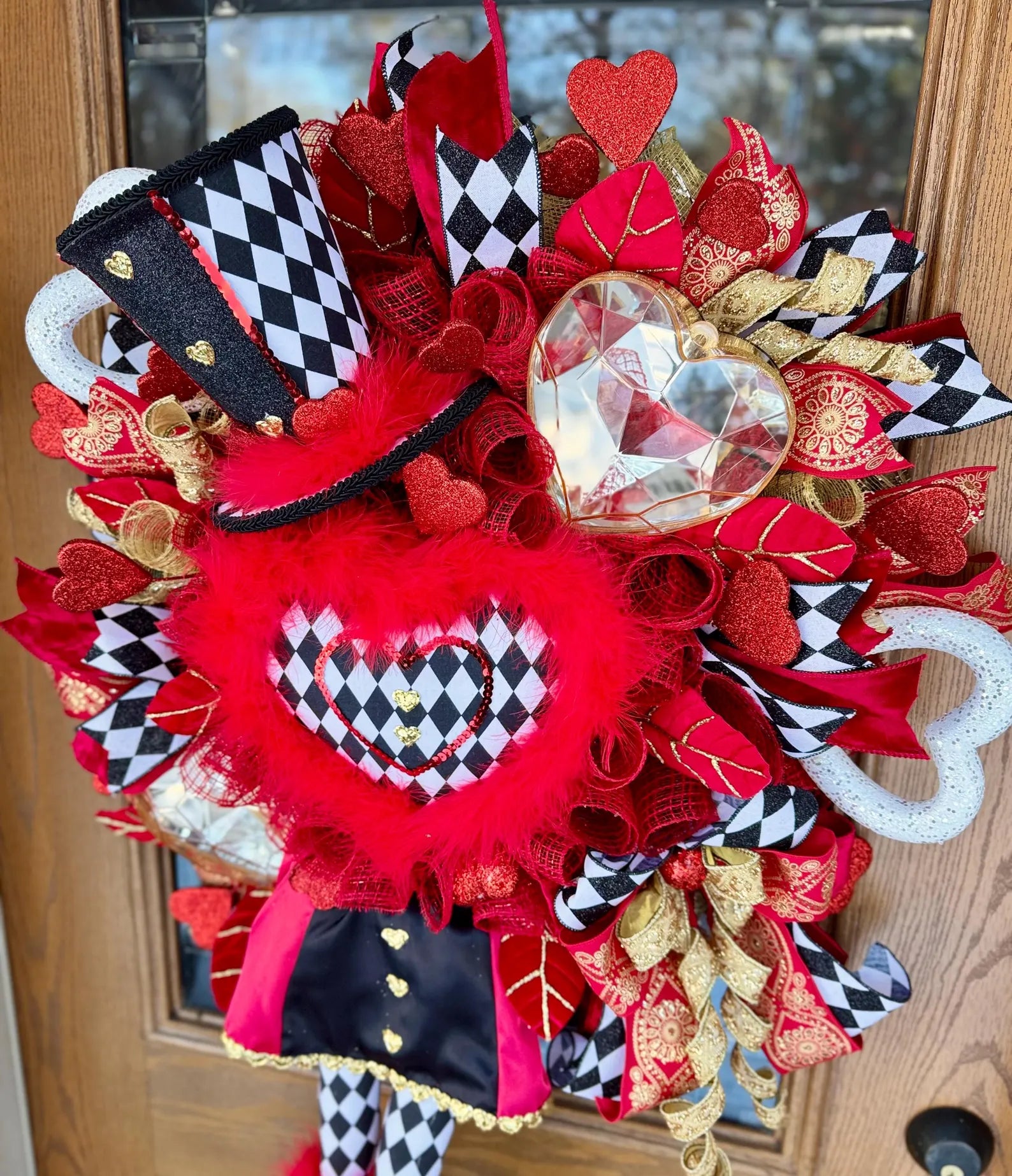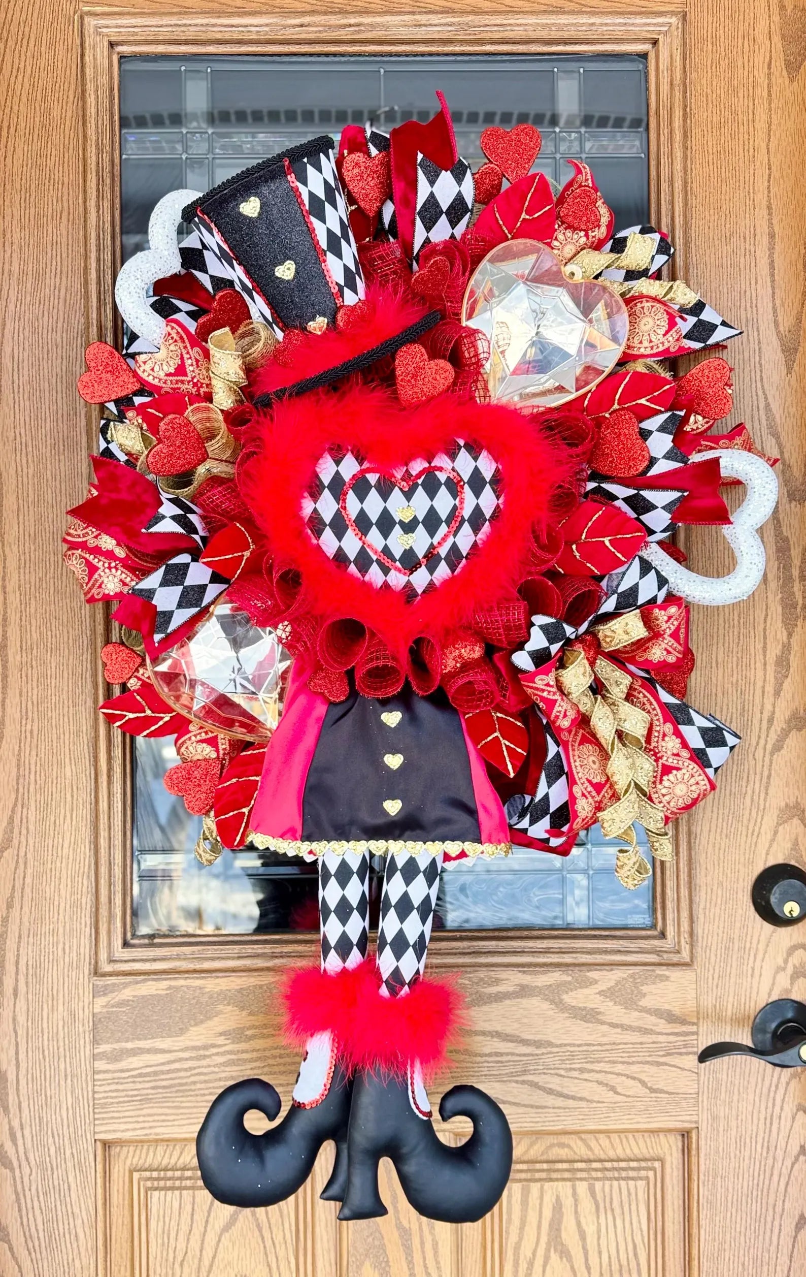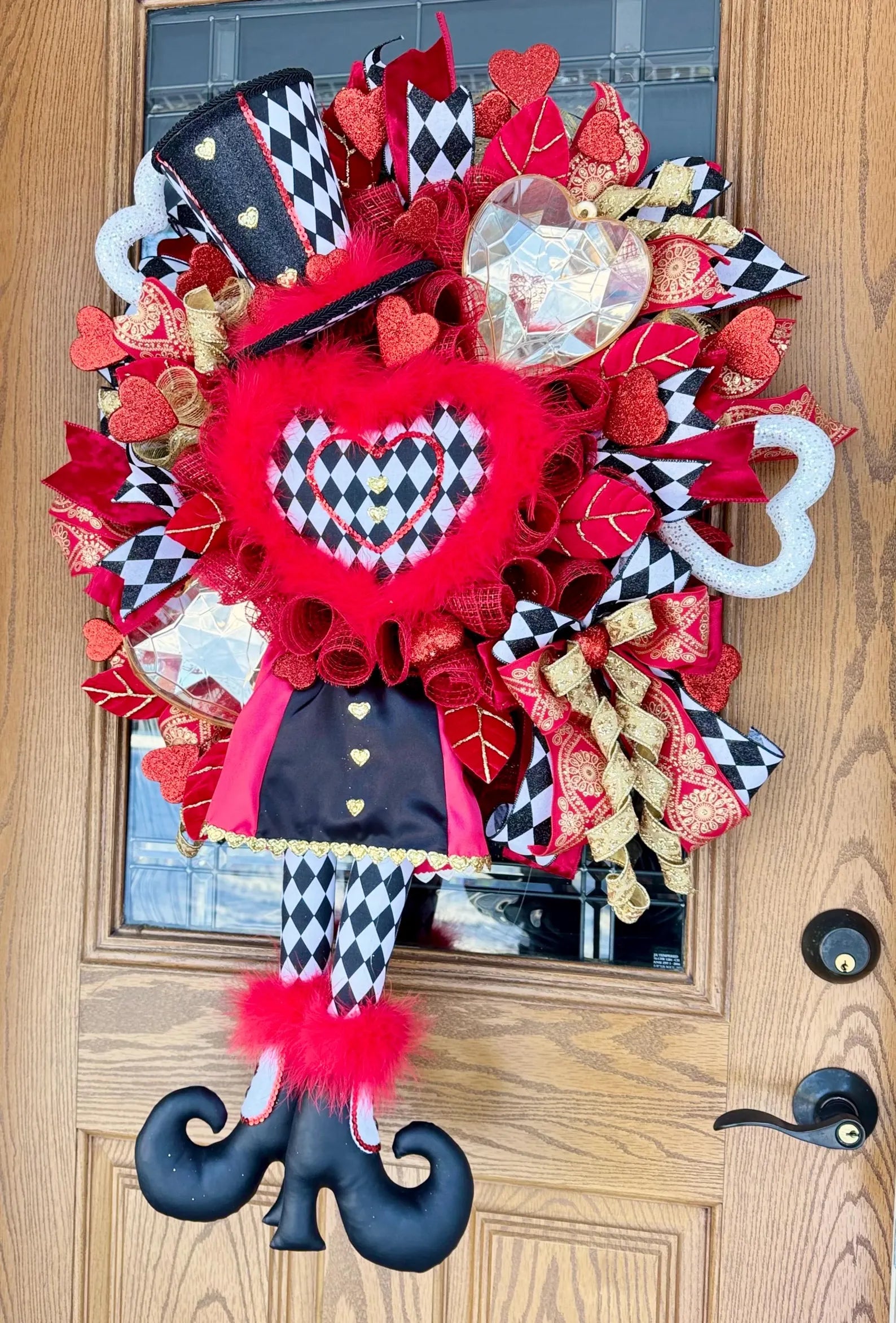 Make your Valentine’s decor unforgettable with this whimsical wreath featuring a handcrafted harlequin heart attachment, glittering hearts, bold red and black accents, and a charming top hat. Perfect for adding a romantic touch to your front door decor or entryway decor!